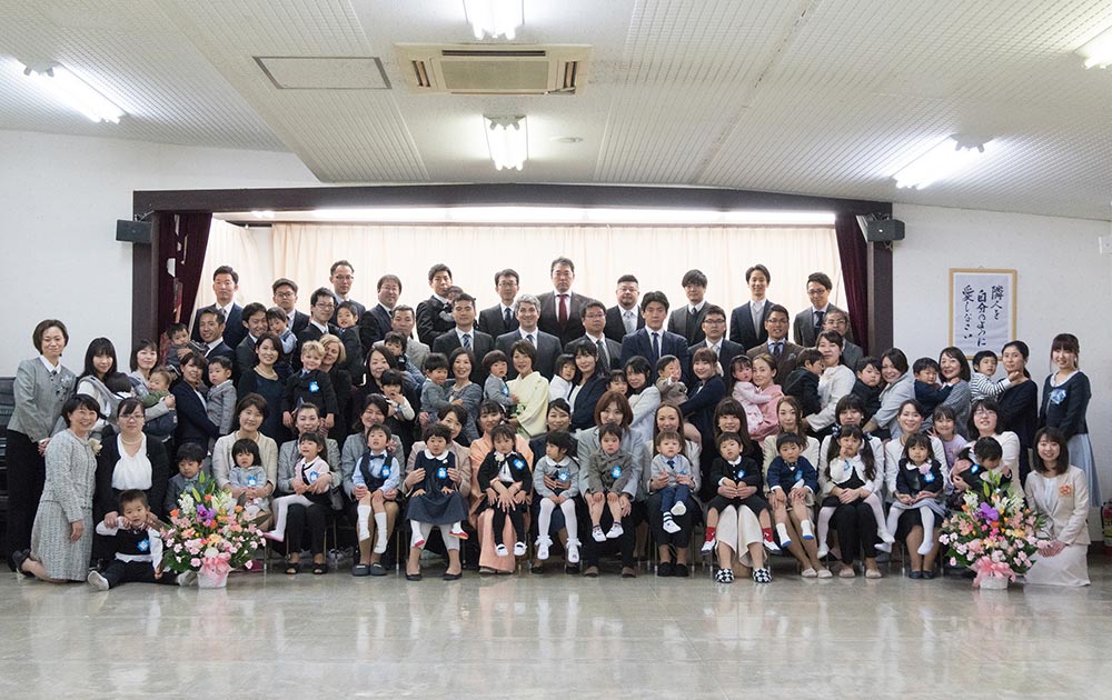 大きい組の子どもたちが小さい組の子どもたちを誘って、礼拝へ。園長先生が聖書の中のお話を子どもたちにわかりやすくお話しします。